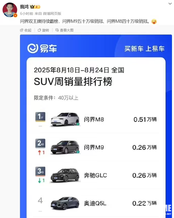 此外,博主“我鸿”今日分享:“问界双王牌持续霸榜,问界M9五十万级销冠、问界M8四十万级销冠。”相关图片显示,问界 M8 销量为0.51万辆、问界M9销量为0.26万辆。据了解,自进入2025年,鸿蒙智行延续良好发展态势,已连续34周保持周交付量破万,累计交付规模更是突破40万台,领先优势不断扩大。