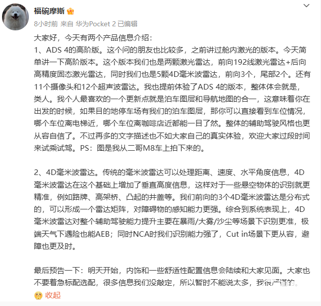 8月27日,问界M7产品经理@福碗摩斯在微博发文,介绍了华为ADS 4高阶版本和4D毫米波雷达的产品信息。