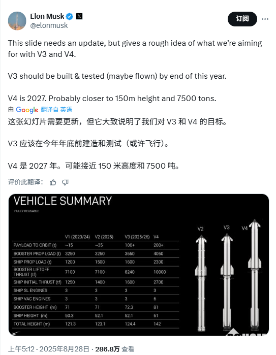 8月28日,美国太空探索技术公司(SpaceX)创始人、董事长兼CEO埃隆·马斯克在社交平台X上发文称,“星舰V3应在今年年底前完成建造和测试(或许还要试飞),V4预计在2027年推出。