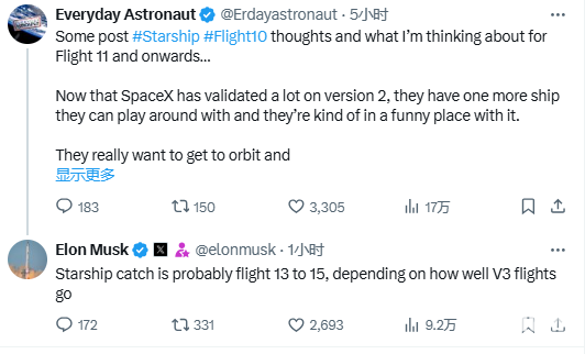 8月28日,美国太空探索技术公司(SpaceX)创始人、董事长兼CEO埃隆·马斯克在社交平台X上发文称,“星舰V3应在今年年底前完成建造和测试(或许还要试飞)。V4预计在2027年推出,其高度可能接近150米,重量约7500吨。”后续,马斯克还在评论区表示,“星舰飞船捕获任务大概会在第13至15次飞行时进行,具体取决于V3飞行的表现情况。”
