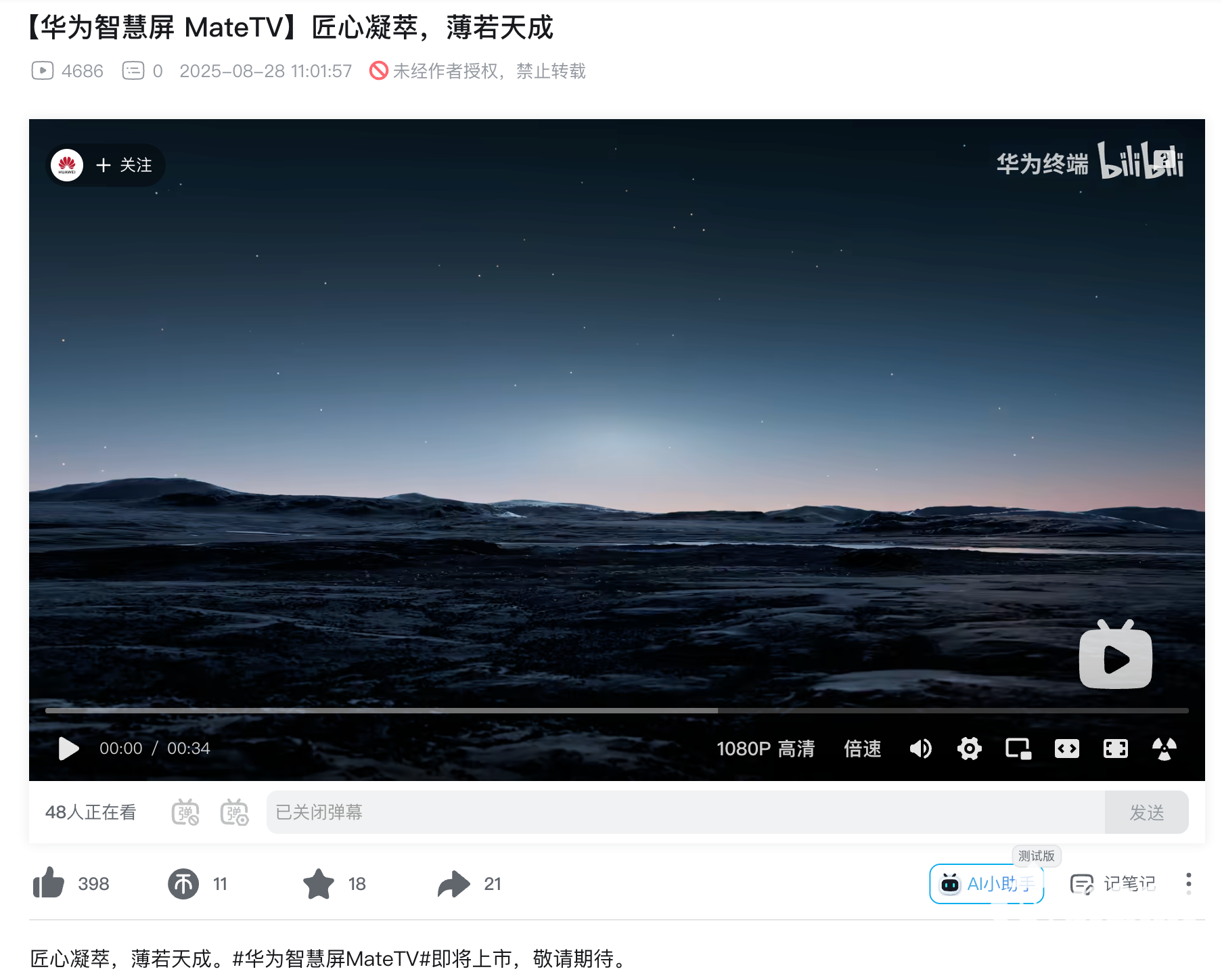 2025年8月28日,华为终端发布消息称,华为智慧屏MateTV官宣即将上市,宣传口号为“匠心凝萃,薄若天成”。