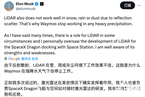 马斯克表示,“由于反射散射,LiDAR在雪、雨或灰尘环境下工作效果不佳。这就是为什么Waymos在强降水天气下会停止工作。正如我多次说过的,激光雷达在某些情况下确实发挥着作用,我个人也曾负责SpaceX Dragon飞船与空间站对接时激光雷达的研发。我非常清楚它的优势和劣势。”