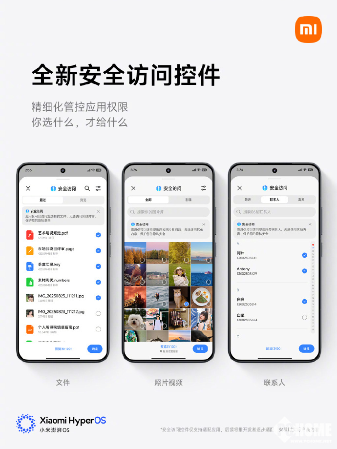 全新安全访问控件允许用户对应用权限进行更精细化管理。用户可针对文档、照片视频、联系人等数据类型,自主决定是否授权。