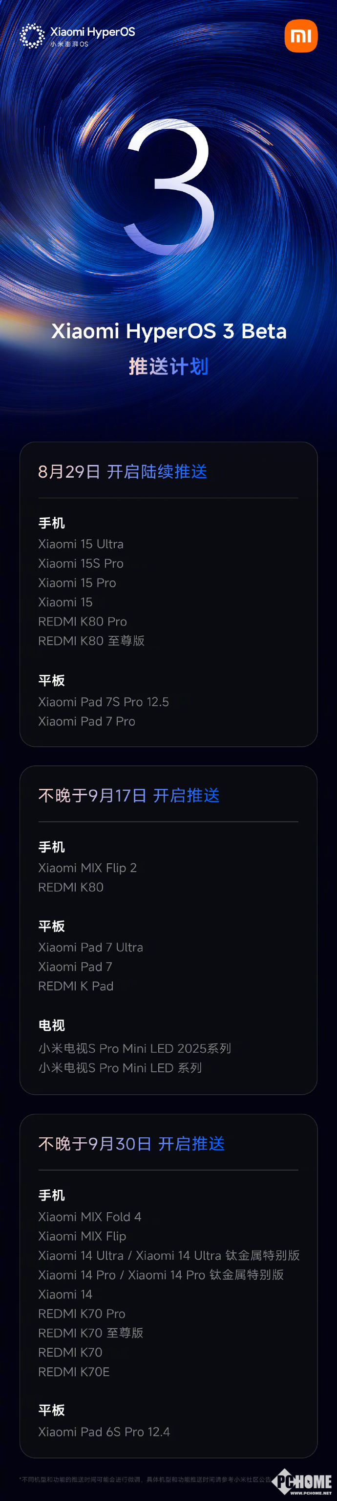 小米澎湃OS 3推送计划共设置3个时间点——8月29日、9月17日和9月30日。分析认为,按批次分阶段推送有助于小米开展分批测试和优化,降低大规模推送可能出现的系统问题风险。同时,考虑到新机型的用户基数相对较大,澎湃OS 3会优先覆盖新发布的机型(如小米15系列、REDMI K80系列等)。本次推送计划涵盖了手机、平板和电视等多种设备类型,能够保障用户在不同设备上及时体验新系统的功能和优化。