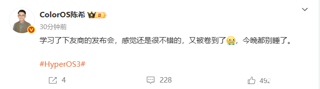 8月28日,小米澎湃OS 3发布会今日正式召开。随后ColorOS设计总监陈希发文表示“感觉还是很不错的,又被卷到了,今晚都别睡了。”