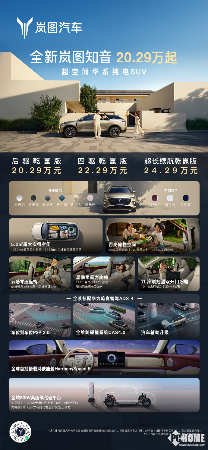 岚图知音搭载满配华为全家桶,除了配备乾崑智驾ADS 4系统外,还搭载新一代鸿蒙座舱HarmonySpace 5,全车华系智能科技拉满。全新岚图知音纯电SUV还号称“超空间华系纯电SUV”,内置VOYAH Sound剧院级音响系统,采用7.1.4扬声器布局+大师级极致调音。