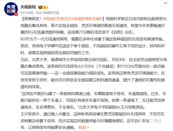 8月28日,央视新闻在微博发文称,近日,北京大学与香港城市大学联合研究团队成功研制出超宽带光电融合集成系统,突破6G关键技术,首次实现全频段、灵活可调谐的高速无线通信。