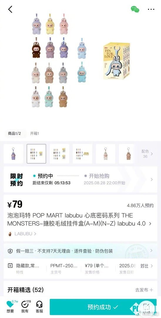 官方信息显示,迷你版Labubu单个售价79元,高约10.5厘米,整组包含14个常规款及1个隐藏款,每组售价1106元,隐藏款抽中概率为1:168。目前,泡泡玛特天猫旗舰店页面显示已有超过47.6万人标记“想要”;在得物平台,预约人数达4.86万人。