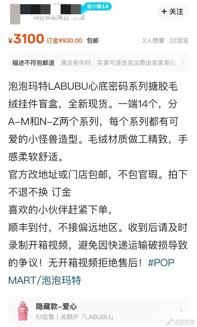 与此同时,二手市场价格快速攀升。记者在多个二手交易平台发现,一组迷你版Labubu最高标价达3100元,较原价上涨约180%。部分卖家要求提前支付订金,并通过改地址或线下代提货的方式交付。港版Labubu同样被炒作,有黄牛在原价基础上增加350元“自提资格码”,单只价格高达429元,溢价幅度超过400%。