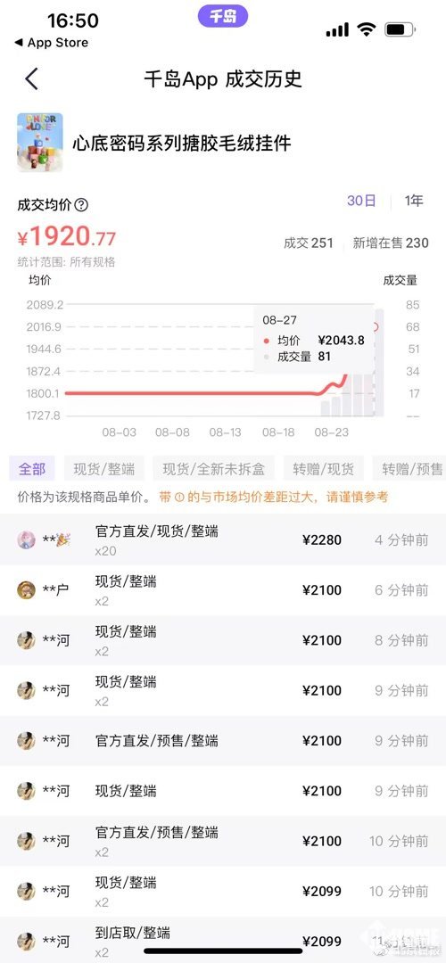 成交数据显示,截至8月28日,二手交易平台上共有251件迷你版Labubu完成交易,成交均价约1920元,当天部分成交价达到2100元。隐藏款更是成为炒作重点,原价79元的“爱心”隐藏款在平台上最低标价约679元,最高成交价超过1100元。