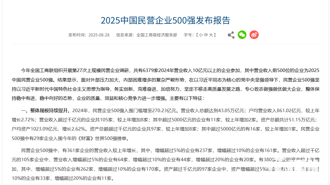 8月28日,中华全国工商业联合会发布"2025中国民营企业500强"榜单,京东集团连续第四年位列第一,同时蝉联服务业榜首。截至2025年第二季度末,京东体系员工总数达约90万人,较2024年同期新增28万个就业岗位,成为创造就业最多的民营企业。
