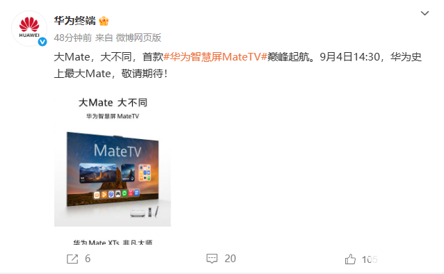 8月29日,华为终端官方正式宣布,首款华为智慧屏MateTV将于9月4日14:30登场,这也将是华为史上最大的Mate。
