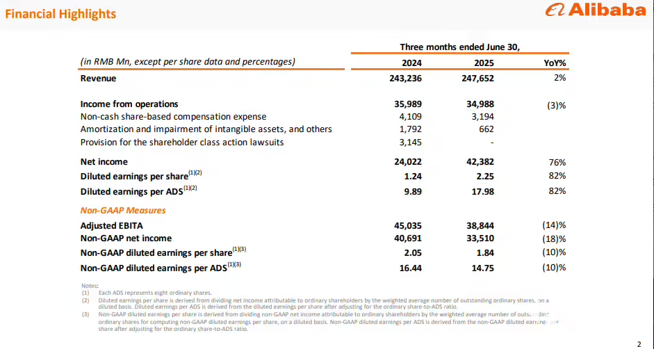 8月29日,阿里巴巴公布了截至2025年6月末的2026财年第一财季财报。该季度,阿里巴巴营收达2476.5亿元人民币,同比增长2%,若剔除已出售业务影响,实际同比增长10%。