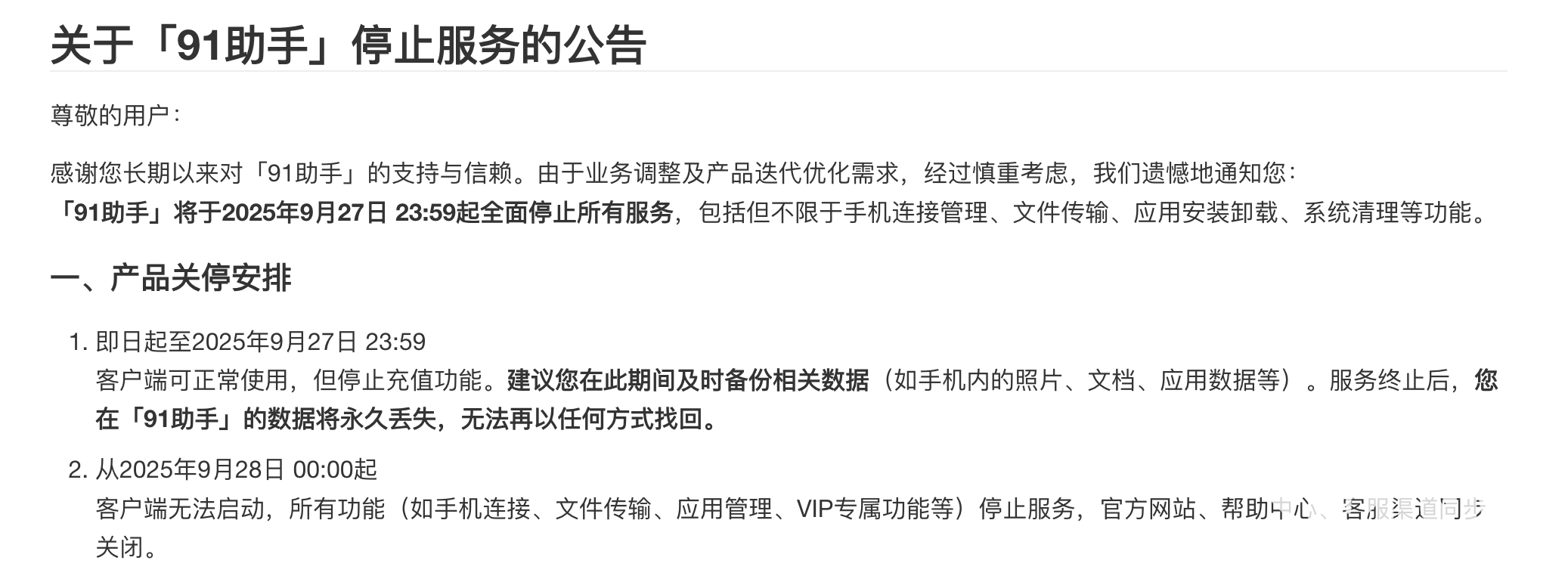 2025年8月31日,91助手运营团队发布公告称,由于业务调整及产品迭代优化需求,91助手应用将于2025年9月27日23:59起全面停止所有服务。届时,手机连接管理、文件传输、应用安装卸载、系统清理等功能都将无法使用。