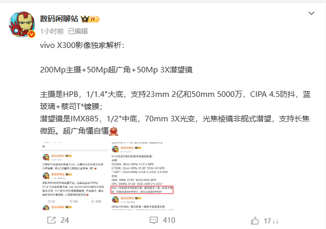 同时,据知名数码博主“数码闲聊站”爆料,vivo X300标准版将配备2亿像素主摄、5000万像素超广角和5000万像素3X潜望镜。其中,主摄采用三星HPB传感器,拥有1/1.4英寸大底,支持23mm 2亿像素及50mm 5000万像素输出模式,并具备CIPA 4.5防抖功能,同时配备蓝玻璃与蔡司T*镀膜,有效减少杂光和鬼影。潜望镜则采用IMX885 传感器(1/2英寸中底),支持70mm 3X光变以及长焦微距拍摄。