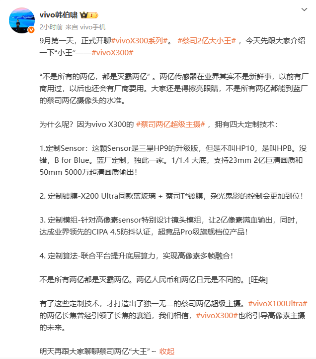 9月1日,vivo通信科技有限公司产品经理韩伯啸今日为vivo X300系列进行预热,介绍了X300标准版的两亿超级主摄影像能力。他表示,“不是所有的两亿,都是灭霸两亿”。