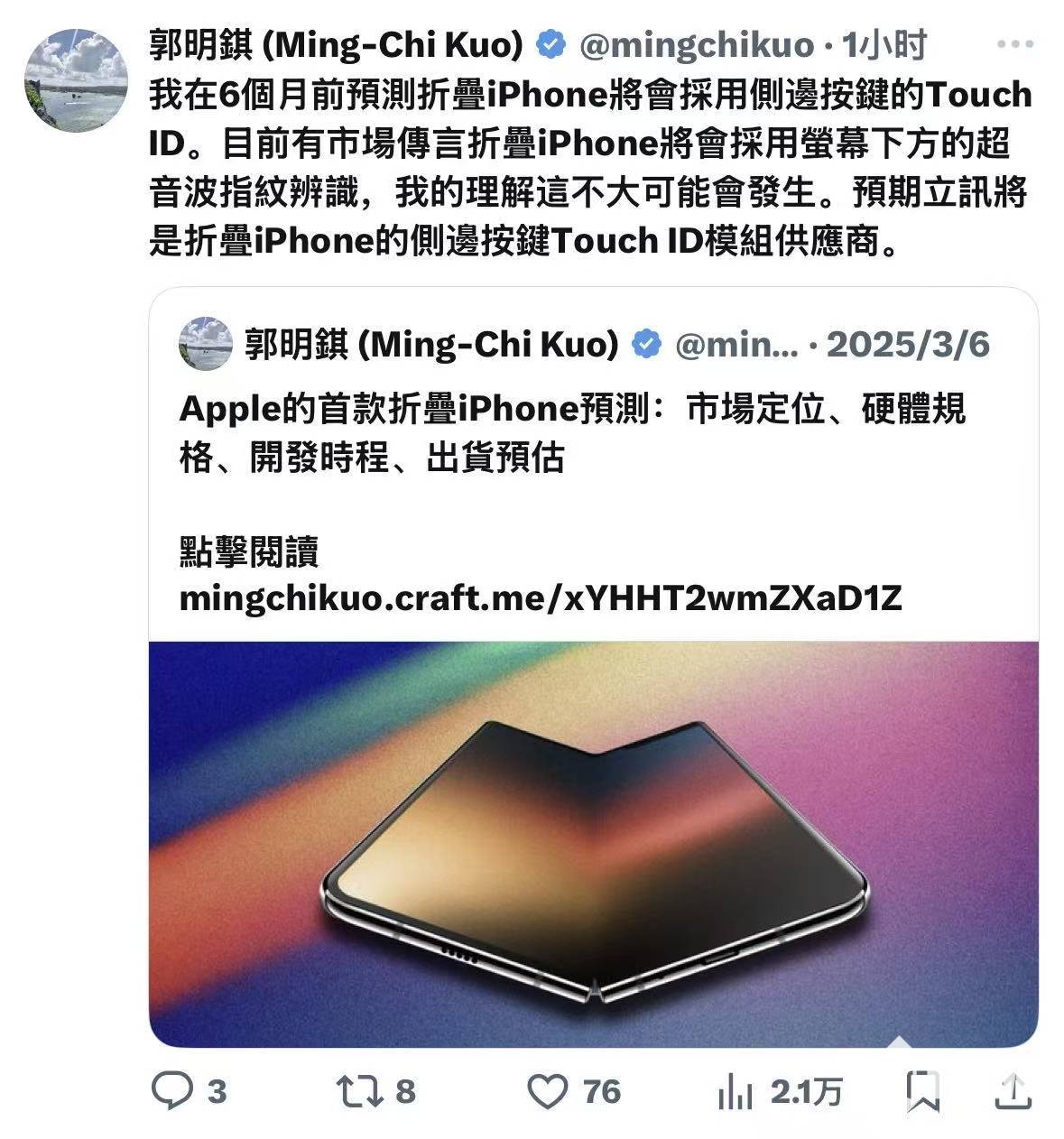 9月1日,天风国际分析师郭明錤最新预测指出,苹果首款可折叠iPhone将不会采用屏下指纹识别技术,而是延续侧边按键Touch ID方案。