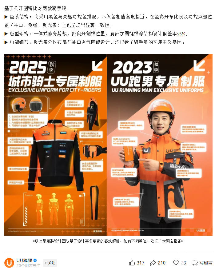 UU跑腿强调,“疾风系列跑男工装”于2023年发布,当时未进行大规模宣传。如今两款设计产生相似性,部分网友认为UU跑腿在 “抄袭” 友商。误解性言论混淆公众认知,对其品牌形象与企业声誉造成一定影响。所以才不得不站出来,向大家澄清事实、正式回应。