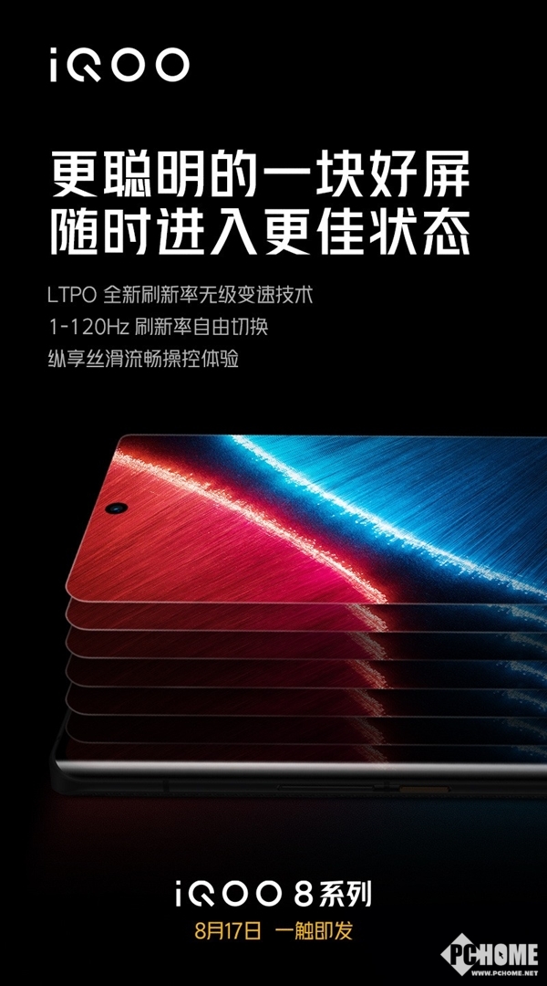 8月17日晚19:30,iQOO将举行发布会正式推出QOO 8系列。今日下午,官方再次发文预热新机。iQOO官方表示,iQOO 8系列将搭载最新 LTPO 刷新率无级变速技术,1-120Hz 针对多场景适配优化,丝滑流畅,纵享操控体验。终极揭秘,一触即发!
