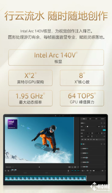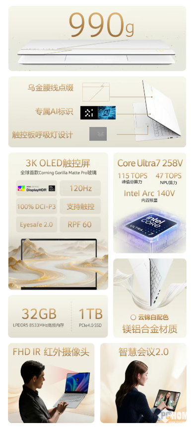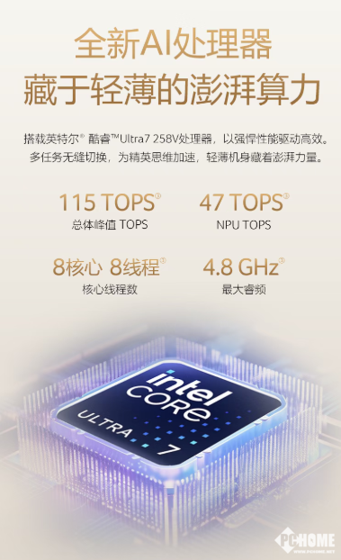 配置上,该机搭载英特尔酷睿Ultra7-258V处理器,最高睿频达4.9GHz,内置NPU单元,单体算力47TOPS,总峰值算力可达115TOPS。显卡部分为Arc 140V核显,基于Xᵉ2架构,最高动态频率1.95GHz。存储规格包括32GB LPDDR5X 8533MHz高速内存,采用MOP设计,配合1TB PCIe 4.0固态硬盘。