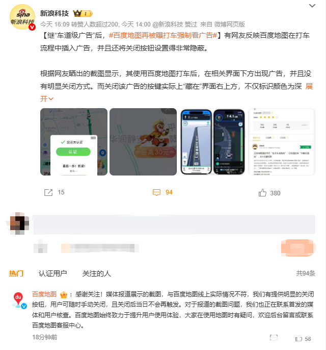 9月1日,有用户和媒体反映,在使用百度地图APP打车服务时,应用内广告的关闭按钮位置较隐蔽,存在难以找到的情况。对此,百度地图回应称,相关报道截图与实际情况不符,百度地图提供有明显的关闭选项,用户可随时手动关闭广告,且在关闭后当天不会再次弹出。