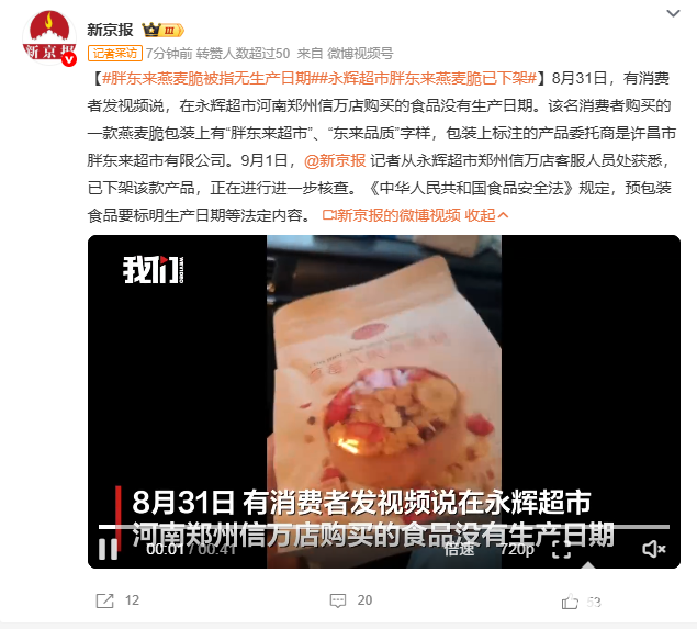 9月1日,据新京报今日报道,昨日有网友发视频表示,在永辉超市河南郑州信万店购买的食品没有生产日期。