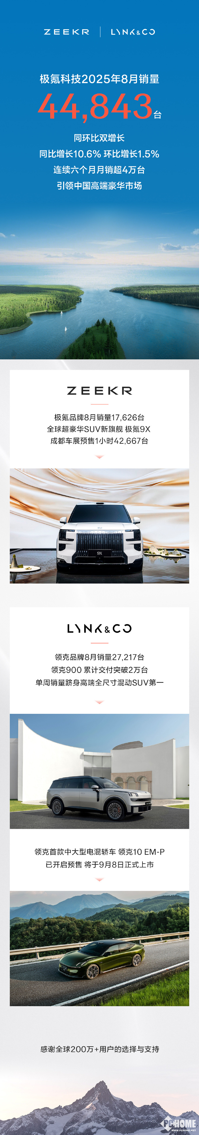 从品牌内部来看,极氪品牌8月销量为1.76万台。值得一提的是,在8月29日成都车展开启预售的极氪9X,表现极为火爆,预售1小时便狂揽4.26万台订单。而领克品牌在8月销量达 2.72万 台,其中领克900累计交付已突破2万台,并且单周销量跻身高端全尺寸混动SUV第一,展现出稳定的市场表现。