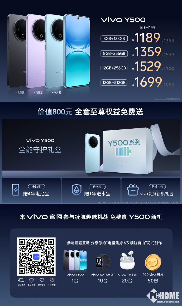 vivo Y500售价方面:8GB+128GB为1399元,国补后1189元;8GB+256GB为1599元,国补后1359元;12GB+256GB为1799元,国补后1529元;12GB+512GB为1999元,国补后1699元。预售现已开启,9月5日正式开售。预售及首销期间,用户可享受超过800元的超值好礼,包括4年电池宝、1年进水宝、全能守护礼盒、vivo会员新机礼包等,还有至高300元的以旧换新补贴,至高6期分期免息。