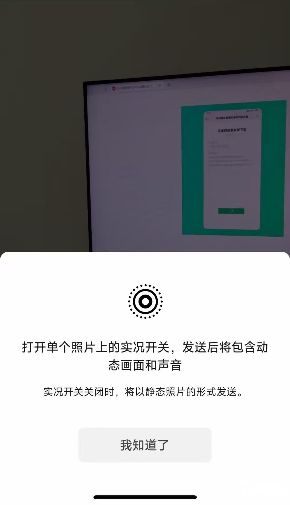 用户在发送图片时,界面中会出现单个照片的实况开关,开启后发送的照片将包含动态画面和声音;若关闭实况开关,则以静态照片形式发送。需留意的是,在选择图片时,实况状态默认关闭,用户发送照片前需点击进入大图预览页面,手动开启单个照片的实况开关,方可实现动态照片发送。