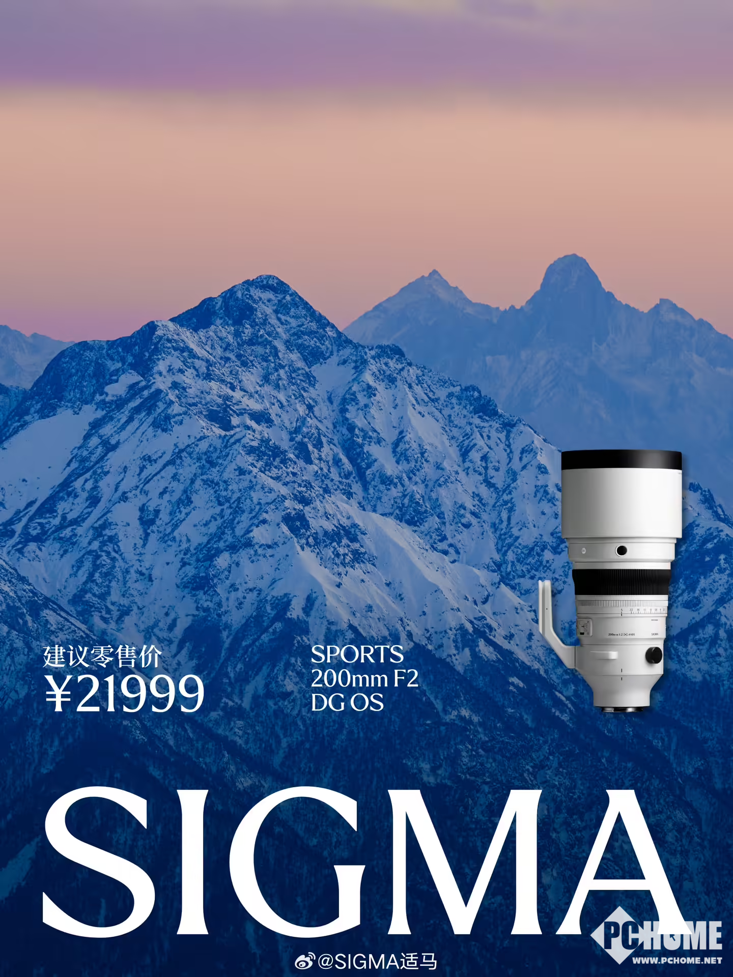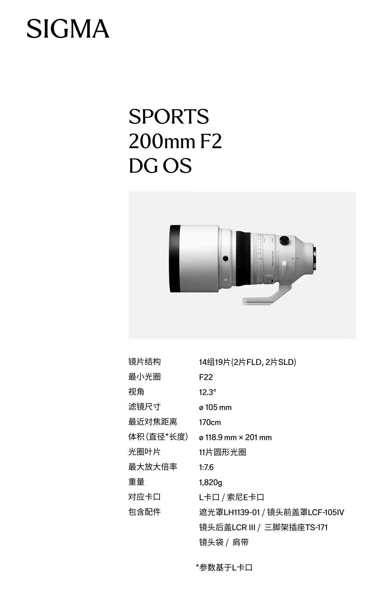 针对全画幅无反相机的200mm F2 DG OS Sports镜头定价21999元,该镜头采用14组19片光学结构,包含2片FLD和2片SLD特殊镜片,重量达1820克,配备三脚架插座和专用镜头袋,主要面向专业体育和生态摄影领域。