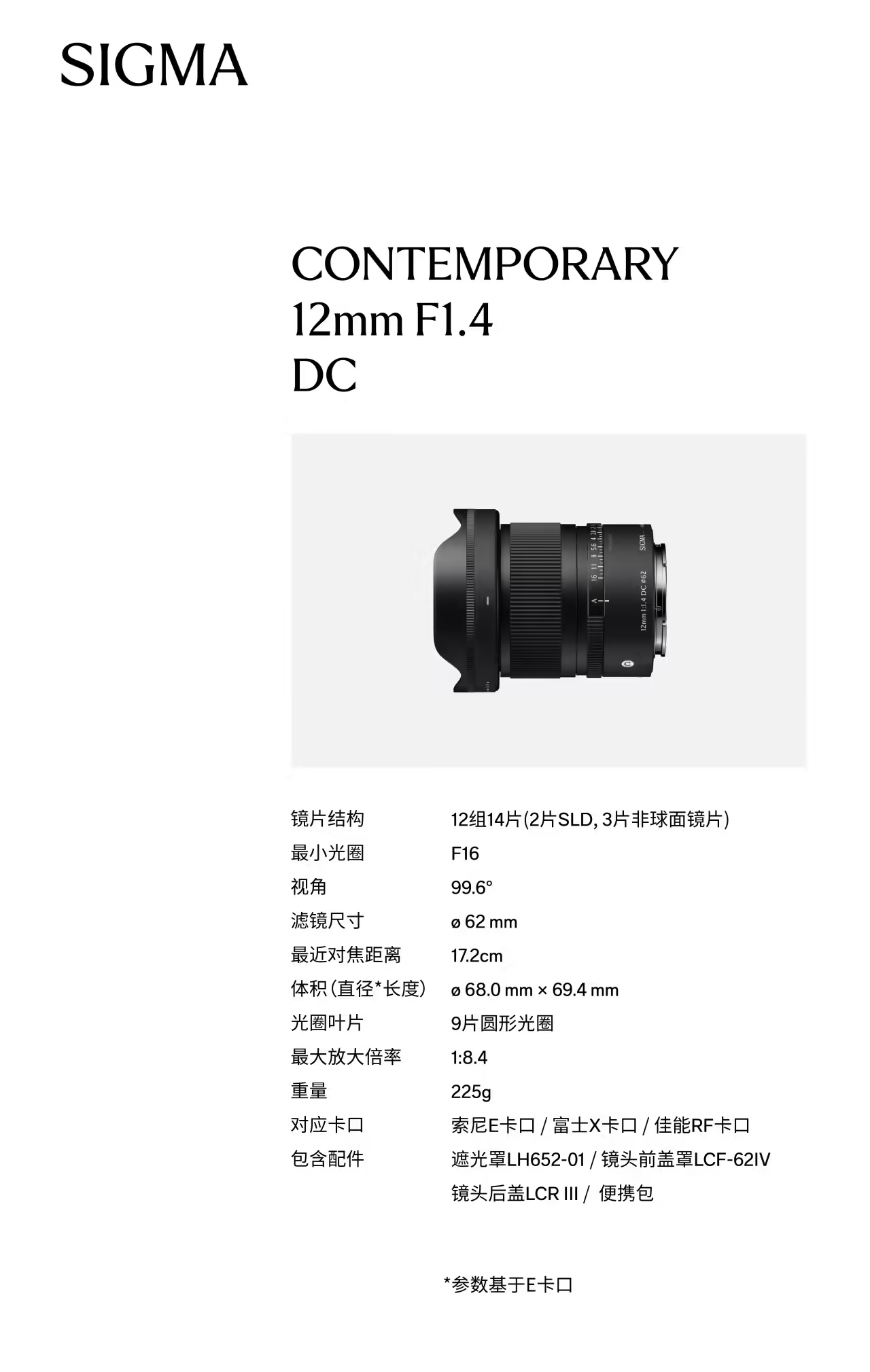 同期发布的12mm F1.4 DC Contemporary镜头定价3888元,专为APS-C画幅无反相机设计,具有99.6°超广视角和17.2cm最近对焦距离,重量仅225克,适用于索尼E、富士X和佳能RF卡口。