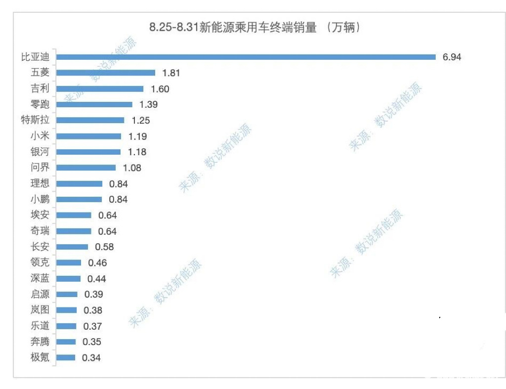 8月25日-8月31日新能源乘用车终端销量榜单新鲜出炉,各品牌销量表现备受关注。在这份榜单中,比亚迪以6.94万辆的亮眼成绩稳居榜首,展现出强大的市场统治力。