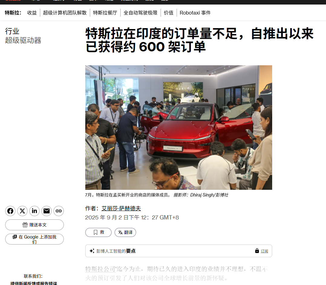 9月2日,据彭博社今日报道,特斯拉自7月中旬在印度推出以来,仅获得约600份汽车订单,远低于该公司自身预期。这一数字大致相当于今年上半年特斯拉在全球每四小时交付的汽车数量。