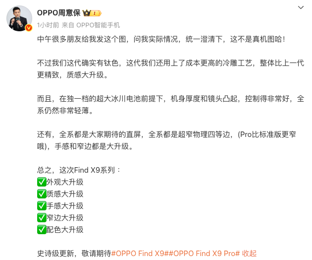 OPPO Find系列产品负责人周意保在社交媒体发文称,网传的渲染图不是Find X9真机图,但这代确实有钛色,还用上了成本更高的冷雕工艺,整体比上一代更精致,质感大升级。