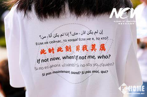 阿里20周年年会的文化衫,背部设计将升级版的阿里价值观“新六脉神剑”以六种国际语言形式展现,正面则将年会标识延展在文化衫上,还设计了双色纽扣。在“双11”大促期间,阿里员工会穿着统一的“双11”战袍,红色的文化衫上有“定胜”等文案。