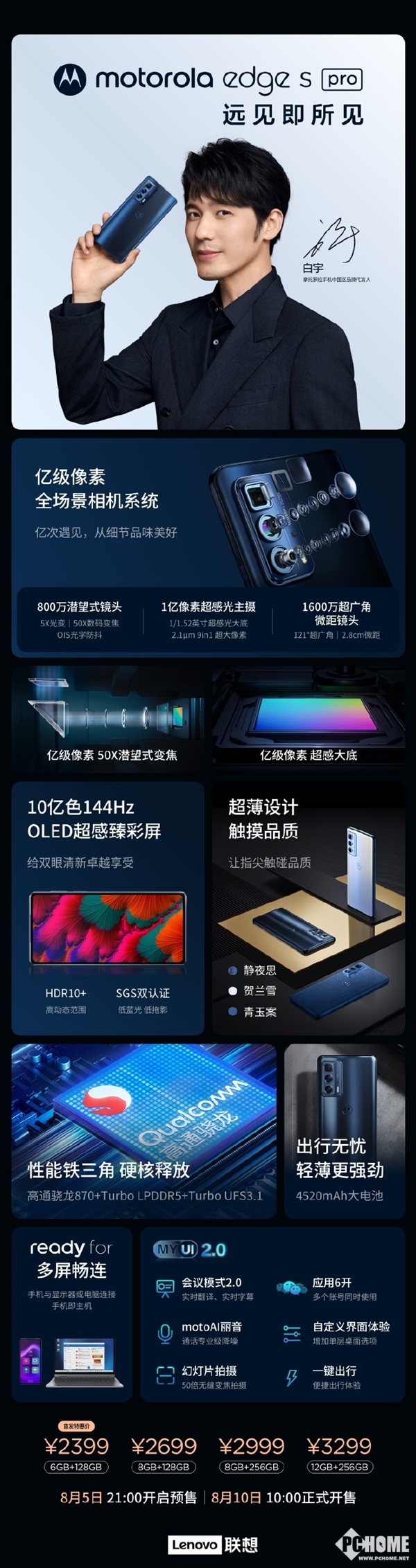 8月5日晚,摩托罗拉的edge系列发布会上,摩托罗拉edge s pro和摩托罗拉edge轻奢版正式亮相。其中摩托罗拉edge s pro做到了超薄设计,该机重量只有189g,厚度为7.99mm,而且还采用全场景相机系统,包含一亿像素主摄+50倍潜望式变焦,这也是摩托罗拉手机第一次使用潜望镜式的长焦镜头。