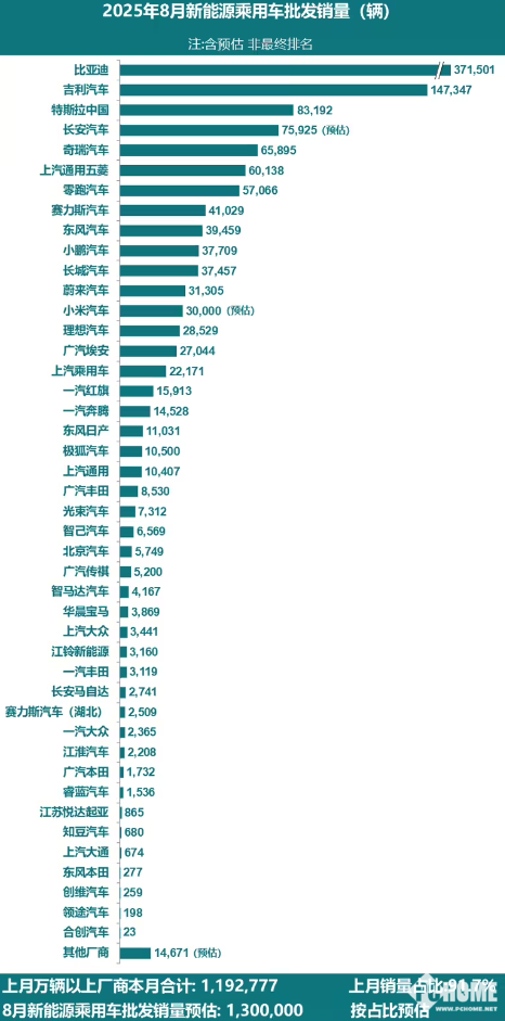 从厂商排名来看,比亚迪以37.1万辆的成绩一骑绝尘,在市场中占据主导地位。吉利汽车以14.7万辆位居第二,特斯拉中国以8.3万辆位列第三,长安汽车则以预估7.6万辆紧随其后。此外,奇瑞汽车、上汽通用五菱、零跑汽车也跻身前七,销量分别为6.5万辆、6.0万辆和5.7万辆。赛力斯汽车实现4.1万辆批发销量,小鹏汽车为3.7万辆,理想汽车达2.8万辆,小米汽车预计为3.0万辆。
