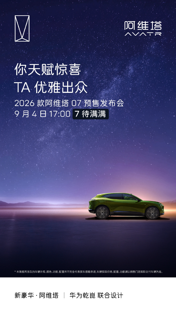 9月2日,阿维塔官方今日正式宣布,2026款阿维塔07将于9月4日正式开启预售。