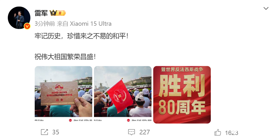 同时雷军也在阅兵仪式现场发文表示,“牢记历史,珍惜来之不易的和平!祝伟大祖国繁荣昌盛!”据了解,此前在2019年10月1日, 雷军就曾作为民营高科技企业家代表的身份受邀参加国庆70周年阅兵仪式,并且乘坐“改革开放”部分彩车,通过天安门广场、接受祖国和人民检阅。