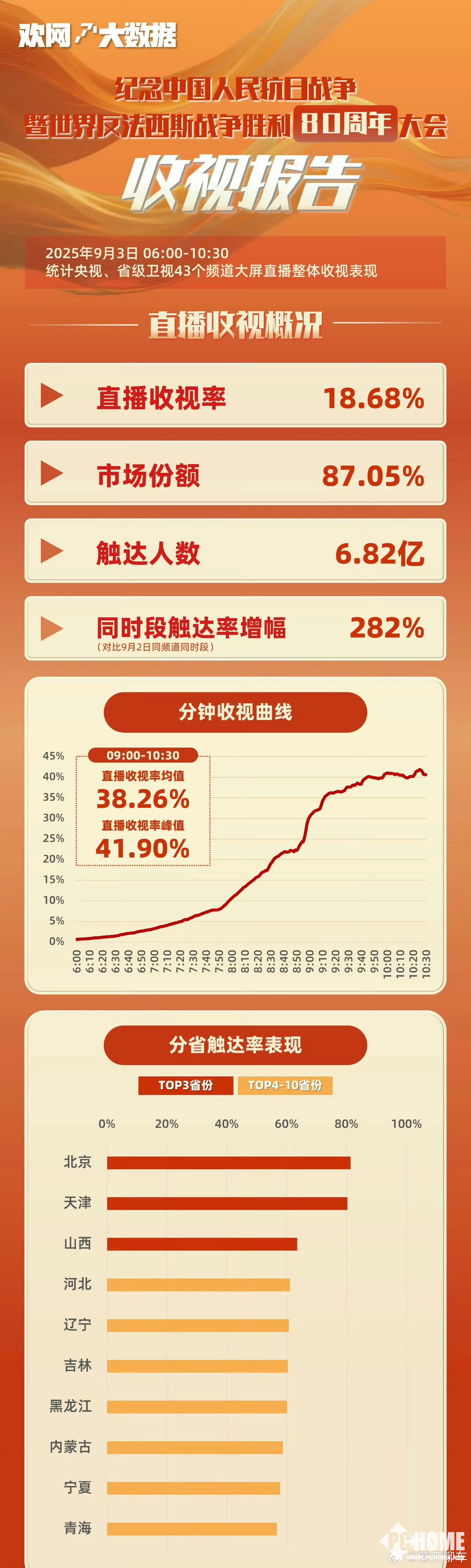 欢网大数据发布《中国人民抗日战争暨世界反法西斯战争胜利80周年纪念大会收视报告》。报告统计央视及43个省级卫视频道06:00-10:30的大屏直播数据:整体直播收视率达18.68%,占同时段总市场份额87.05%,累计触达观众6.82亿人,较9月2日同频道同时段触达率激增282%。