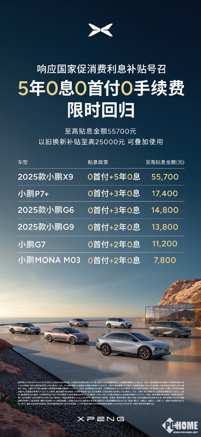 根据官方公布的信息,五年期免息方案涵盖多款车型,其中2025款小鹏X9贴息金额最高可达55700元。该方案可做到5年0息0首付0手续费,其他车型如小鹏P7+、2025款小鹏G6等也享有不同期限的免息优惠。
