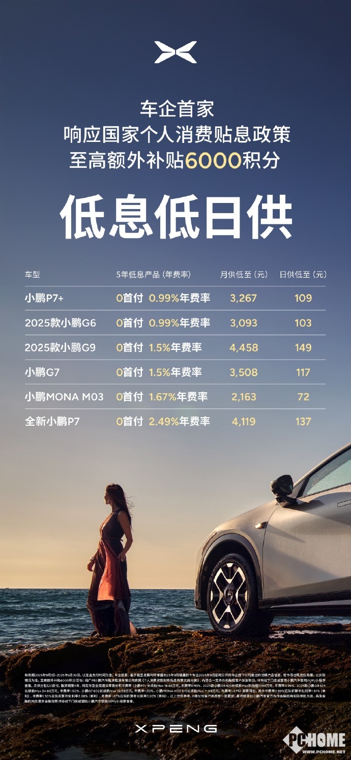 此外,小鹏汽车新增低息低日供方案,年费率从0.99%至2.49%不等。以小鹏MONA M03为例,日供最低为72元。选择该方案的消费者还可获得最高6000积分的额外补贴。同时,公司还会提供以旧换新服务,叠加补贴最高可达25000元。