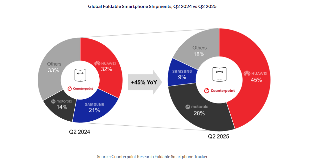 9月4日,市场调查机构CounterPoint Research于昨日发布报告,2025年第2季度全球可折叠智能手机出货量同比增长45%,这主要得益于中国市场的持续走强以及美国市场的激增。