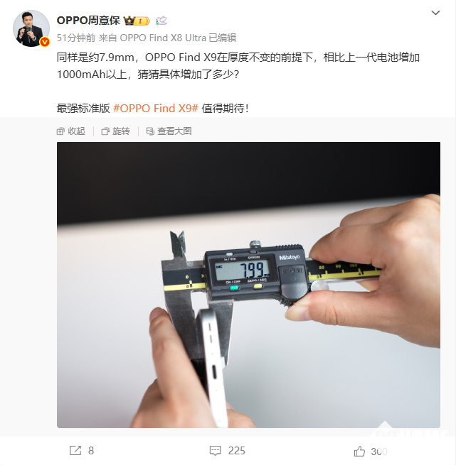 9月4日,OPPO Find系列产品负责人周意保晒出OPPO Find X9测量其厚度约为7.99mm。周意保表示,在厚度基本不变的情况下,OPPO Find X9相比上一代,电池容量增加了1000mAh以上。