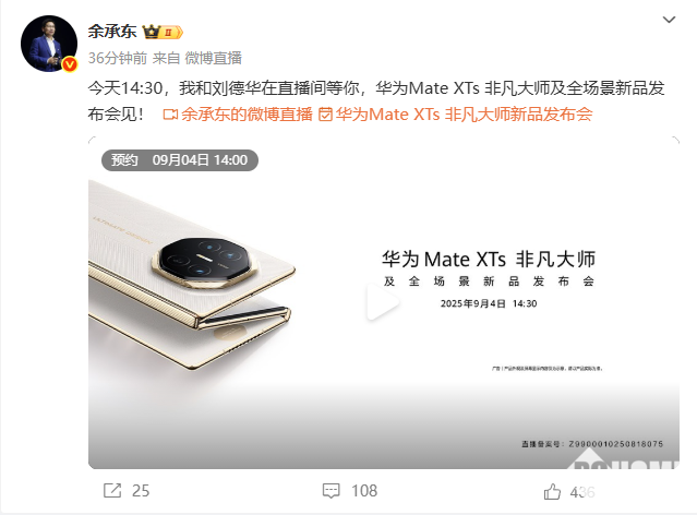 9月4日,华为Mate XTs非凡大师及全场景新品发布会将于今日14:30举办。华为常务董事、终端BG董事长余承东也在社交媒体平台上发文为下午的发布会进行预热表示,“我和刘德华在直播间等你”。