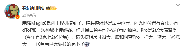 9月4日,据@数码闲聊站最新爆料,荣耀Magic8系列工程机已完成初步测试。新机延续了居中镜头模组设计,但对闪光灯位置进行了调整,并新增dToF传感器和一个未公开功能的小型传感器。