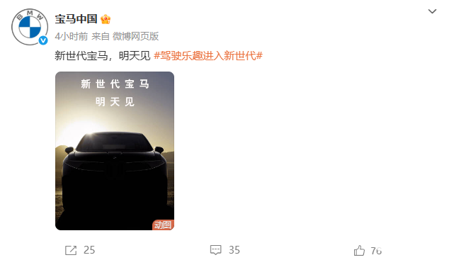 9月4日,宝马中国官微今日发文:“新世代宝马,明天见”。据了解,此前宝马集团宣布,新世代首款量产车型BMW iX3将于9月5日全球首发,并于9月8日亮相慕尼黑车展。中国专属版车型也将在年内与大家见面,2026年在国内投产。