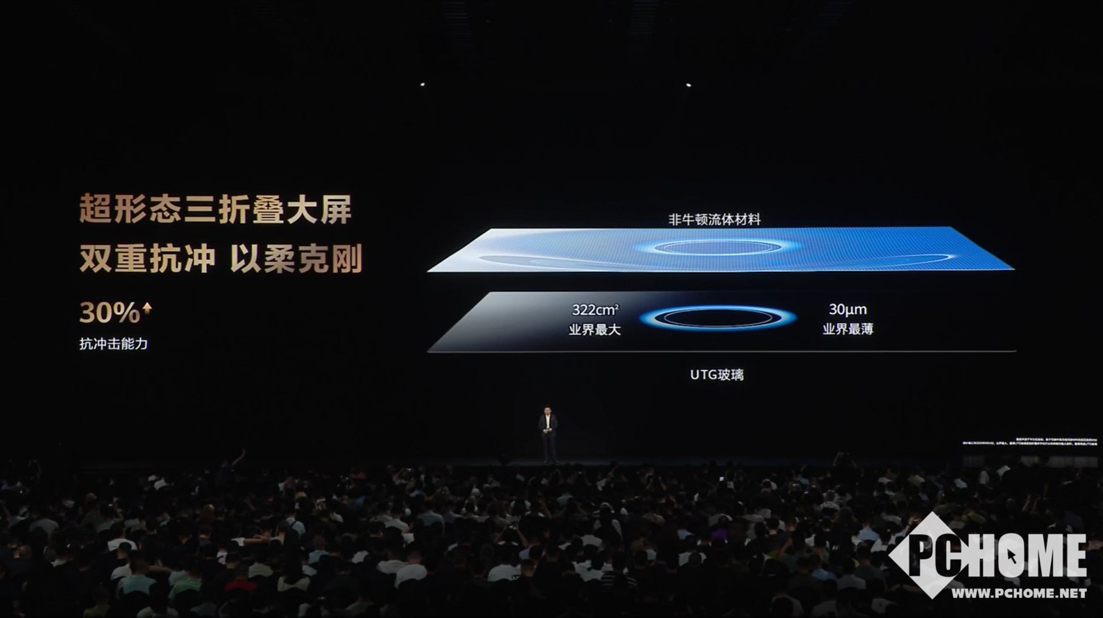 屏幕方面,新机搭载业界最大折叠。屏幕采用30μm超薄UTG玻璃,结合非牛顿流体材料,抗冲击能力提升30%。该材料在受到冲击时瞬间硬化,日常使用保持柔性特性,有效解决折叠屏耐撞性问题。