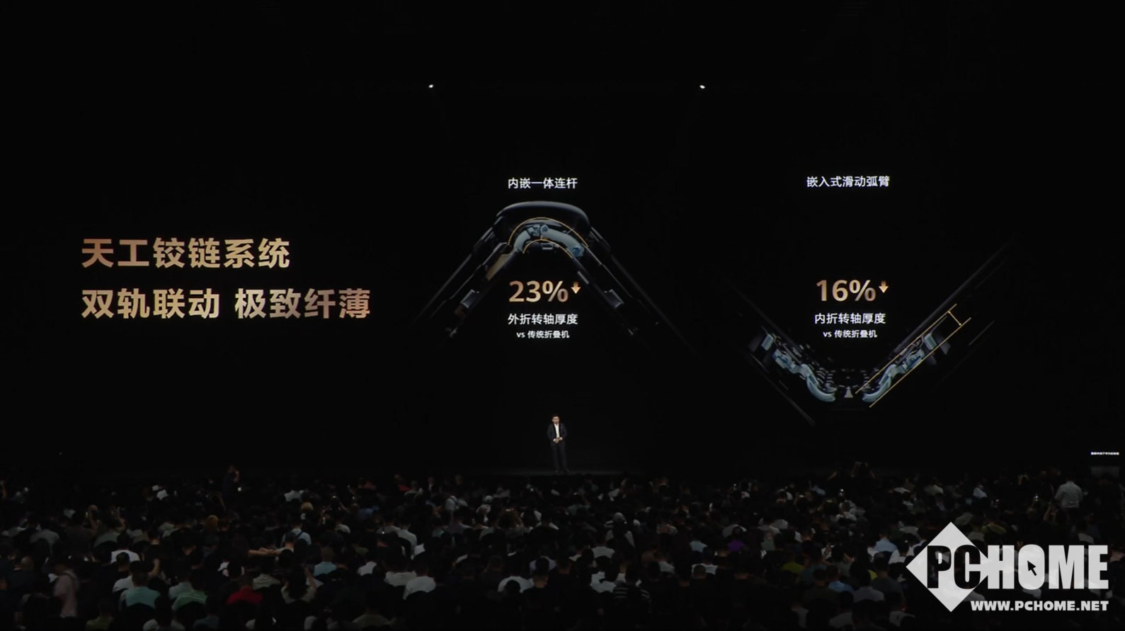 9月4日,华为在Mate XTs非凡大师新品发布会上,介绍新一代天工铰链系统和超形态三折叠屏技术。该铰链采用双轨联动结构,集成内嵌一体连杆和嵌入式滑动弧臂设计,使外折转轴厚度较单侧折叠机减少23%,内折转轴厚度减少16%。