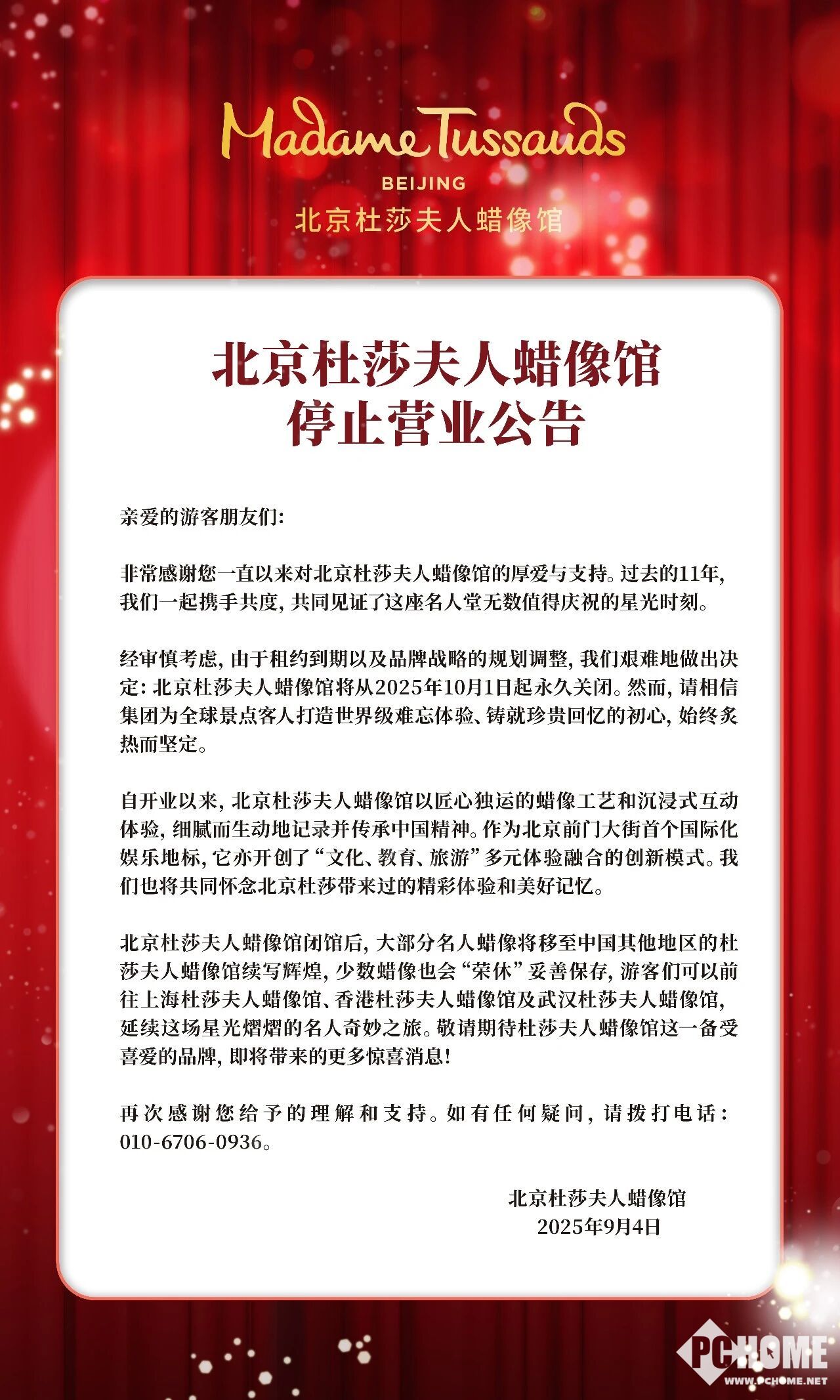 9月4日,北京杜莎夫人蜡像馆发布公告,宣布将于2025年10月1日起永久关闭,该场馆已运营11年。